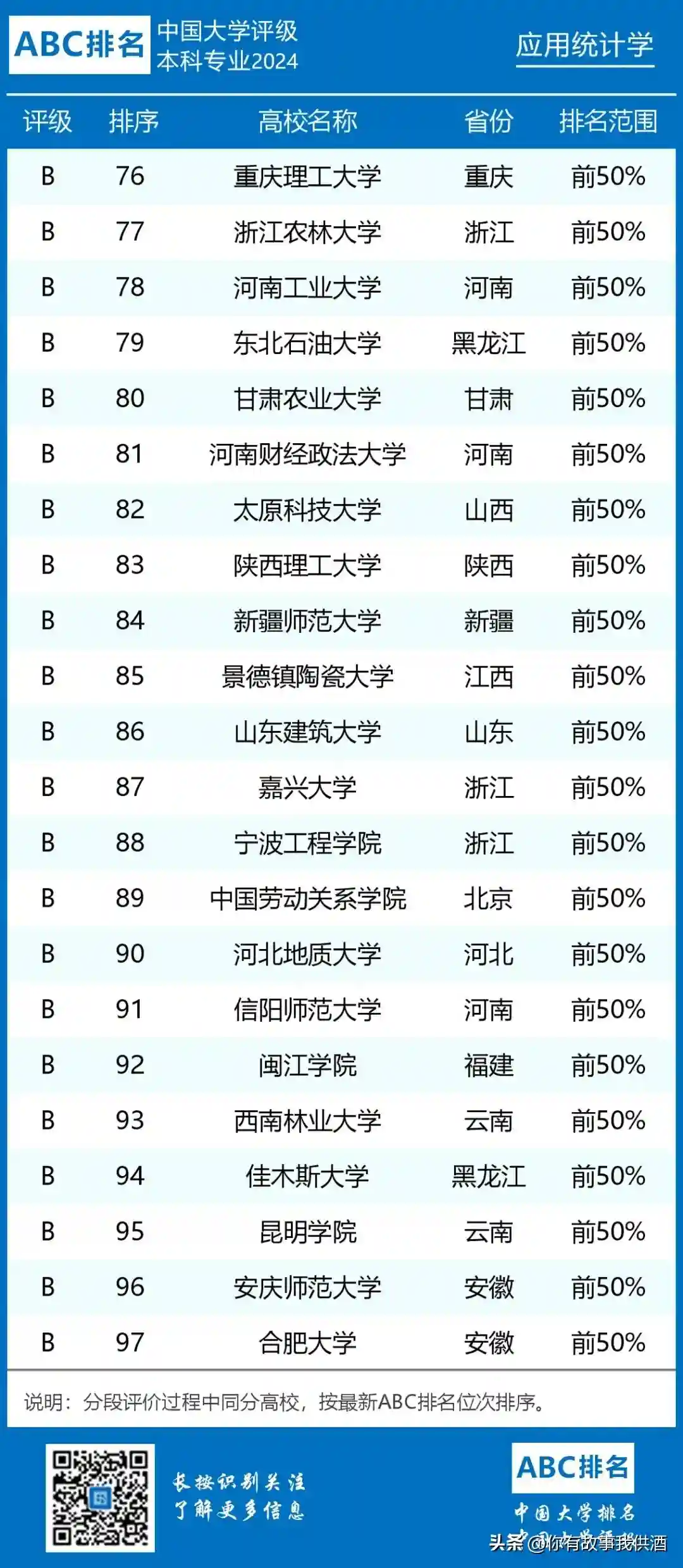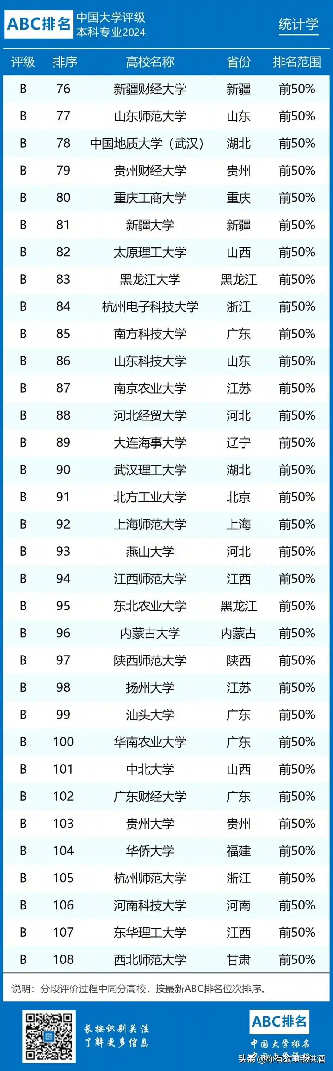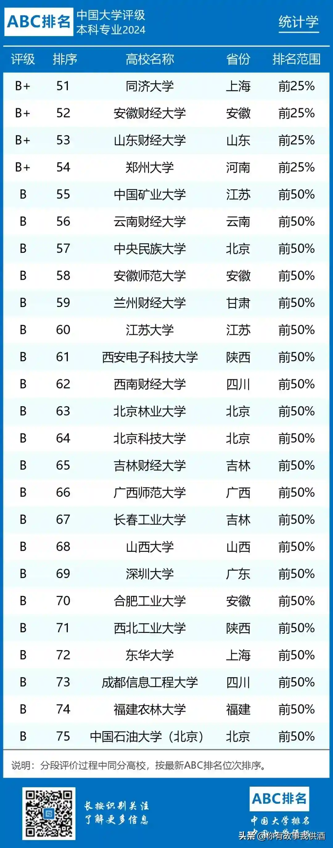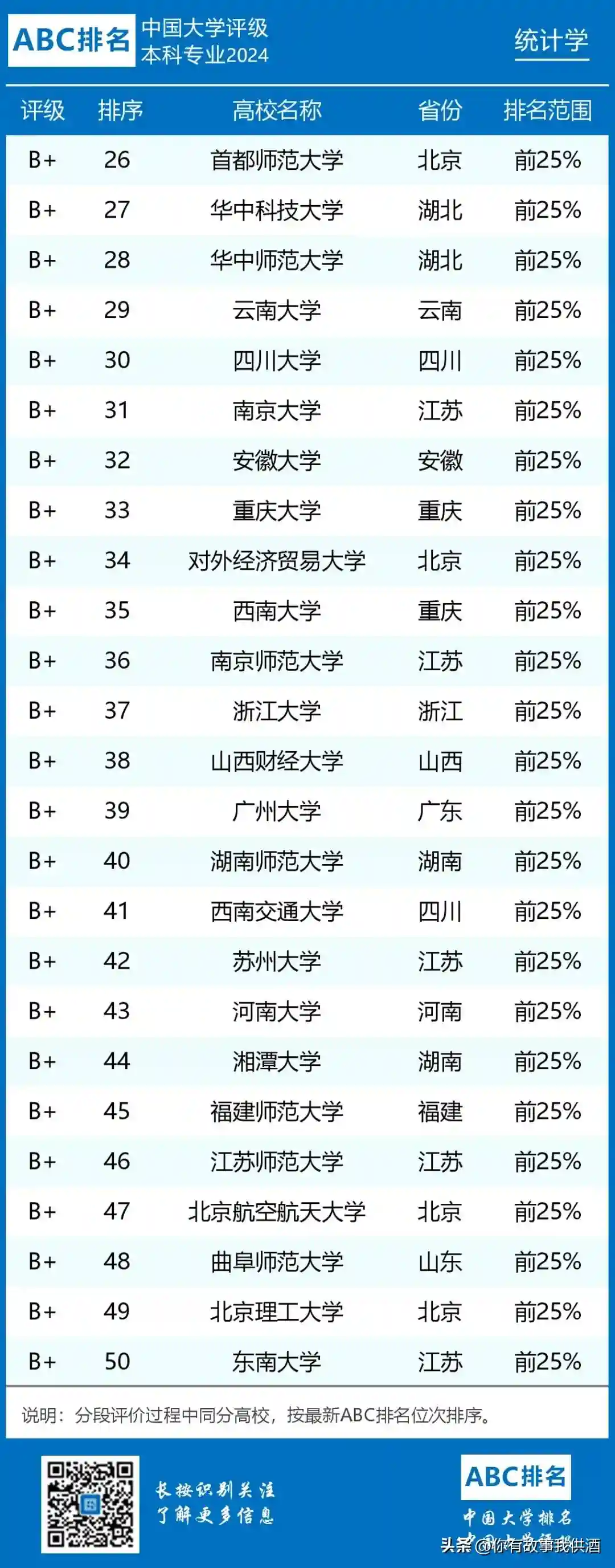 2.应用统计学专业开设院校共194所,B类及以上院校97所。中国人民大学、北京大学、中央财经大学和浙江工商大学位列前四,评级结果为A+;东北财经大学、中南财经政法大学、江西财经大学、北京师范大学、安徽大学、西北大学、云南财经大学等15所院校进入全国排名前10%,评级结果为A。