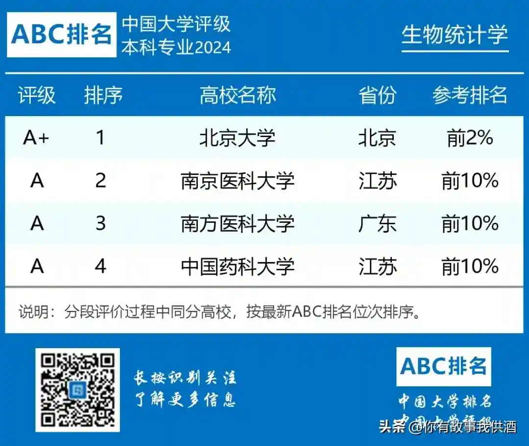 3.生物统计学专业开设院校共8所,B类及以上院校4所。北京大学位列第一,评级结果为A+;南京医科大学、南方医科大学和中国药科大学紧随其后,评级结果为A。